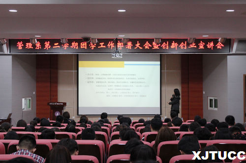 新学期,新气象,新篇章。为加强团队建设,完善管理机制,提高团学组织成员综合素质,确定新学期团学工作发展方向,培养员工创新创业意识,促进员工学科竞赛活动蓬勃开展,西安交大城市学院管理系于3月14日中午在F100召开管理系2017-2018学年第二学期团学工作部署大会暨创新创业宣讲会。莅临本次会议的嘉宾有管理系员工工作主管刘健,管理系团学专项负责人吴江菊。