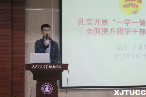 在激昂的团歌声中,本次活动拉开了序幕。首先吴昊翔老师以扎实开展“一学一做”教育实践内涵,全面提升团学干部胜任素质要素为主题展开了讲话。他结合身边的实时热事,阐述了“一学一做”教育实践的深刻内涵,并指出共青团青年要深刻认识开展“一学一做”教育实践的重要意义,把握好政治性、先进性、群众性这一根本目标,贯彻“学习总书记讲话,做合格共青团员”的方针。其次,吴老师就“团学干部胜任素质”这一要素提出了自己的见解。并从管己、管人、管事、沟通、创新五方面作了详细的说明,强调团学干部不仅要全面提高思想觉悟,强化自身的道德素质、心理素质、文化素质,全面发展自我,不断提高个人人格魅力,还要不断增强光荣感和使命感,以蓬勃的朝气和良好的精神面貌投入团学工作中,奉献青春。学校各级党组织要关心和重视共青团工作,严格要求,加强指导,各级团干部要以改革思维推动团的工作,探索工作的新思路、新途径、新方法,努力开创全校共青团工作的新局面。最后他点明“一学一做”和胜任素质之间是因果关系,从而要扎实开展“一学一做”教育实践,全面提高团学干部胜任素质。