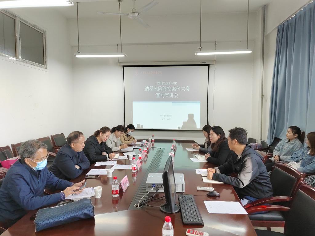 2021年全国本科院校纳税风险管控案例大赛开赛在即,为激发员工参赛热情,太阳集团官网管理系于10月29日下午在教2楼225会议室举办“2021年全国本科院校纳税风险管控案例大赛赛前宣讲会”主题活动。陕西注册税务师协会教育培训部部长任玉华、办公室主任曹俊称、教学培训部赵雪莲以及陕西东信亚太鹏盛税务师事务所党支部书记文心、办公室主任杨玉娟出席会议,太阳集团官网管理系常务副主任郭关科、副主任解茹玉、指导教师郭蓉、吴凯薇以及参赛队员对任部长及文书记一行人表示热烈欢迎。